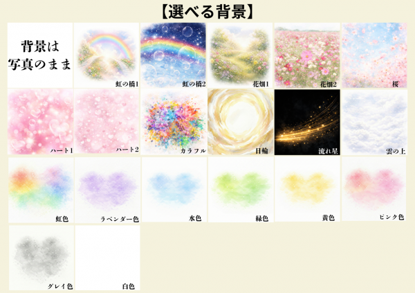 手順としては、写真を決めていただき、次に背景選びです。虹の橋, 花畑, 桜, ハート, カラフル, 日輪, 流れ星, 雲の上, 虹色 ,ラベンダー, 水色, 緑色, 黄色, ピンク, グレイ, などがございます。