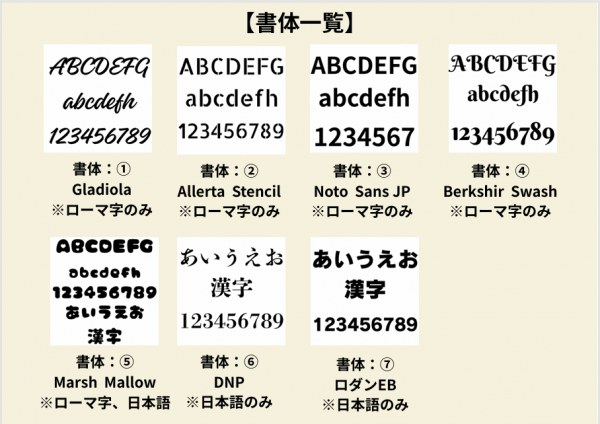 次にフォントを選びです。名前の他にメッセージや(誕生日~命日)を入れる事が可能です。